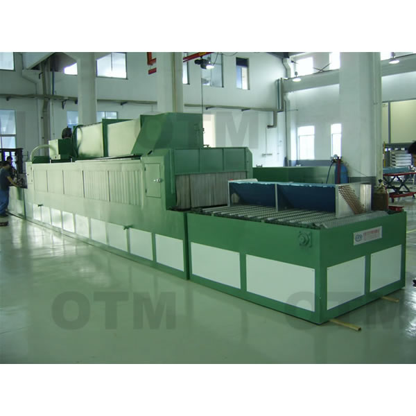 机架采用框架结构,由多种型钢和钢板制作而成,室体上部上罩等制作成双层保温结构,中间填充硅酸铝保温材料(保温层厚度100mm)。烘干室内部两侧加热器后方及底部设有镀锌反射板,使产生的热源相对集中,以提高加热和烘干效果。机体内部还设有电加热元件安装支架,采用型钢制作。机体下部封板采用优质冷轧板制作并进行表面处理。室体在进出料口均设有聚氨脂门帘进行隔离以防热能外串,减少热量损失。