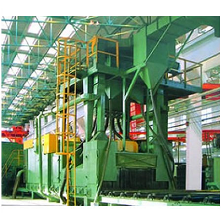 我公司生产的辊道通过式抛丸机,引进德国先进技术,采用PLC控制,将加工工件吊装上辊道,输送到抛丸工作室内作匀速直线运动,经多个抛丸器全方位立体式抛射钢丸,对工件工件表面进行除锈、清理、光饰、强化。有除尘管道将尘埃吸入除尘器内,有高压喷气管将工件表面的钢丸吹清,把丸子输送到喷丸系统循环工作。该产品适用于钢板、型钢、大型管材、大型铸件、钢架结构等工件表面的清理、光饰、强化。完成喷涂前道工序。